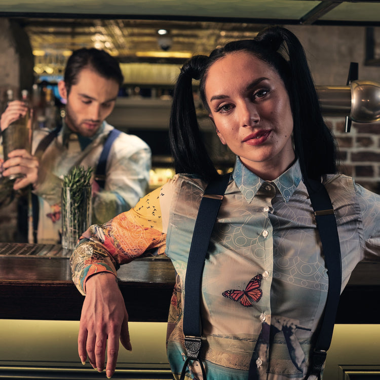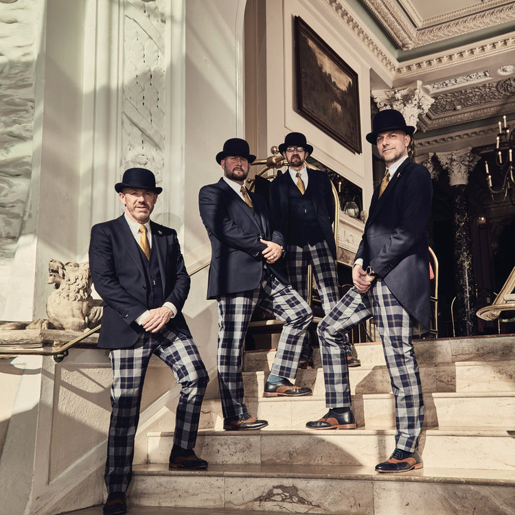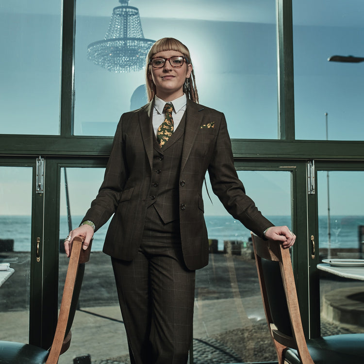 For Riddle & Finns, we built a sharp front of house tailoring system to match Brighton’s most iconic champagne and oyster bar. The collection centres on an exclusive deep brown checked suiting cloth developed just for them and held in stock at our workshop, keeping top-ups fast and colour consistent as the team changes. Finished with subtle green trims and a bespoke octopus print tie and pocket square, the result is polished, timeless, and unmistakably Riddle & Finns, with stock and reorders managed through the GB Studios client portal and dedicated account support.