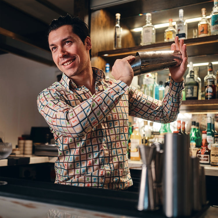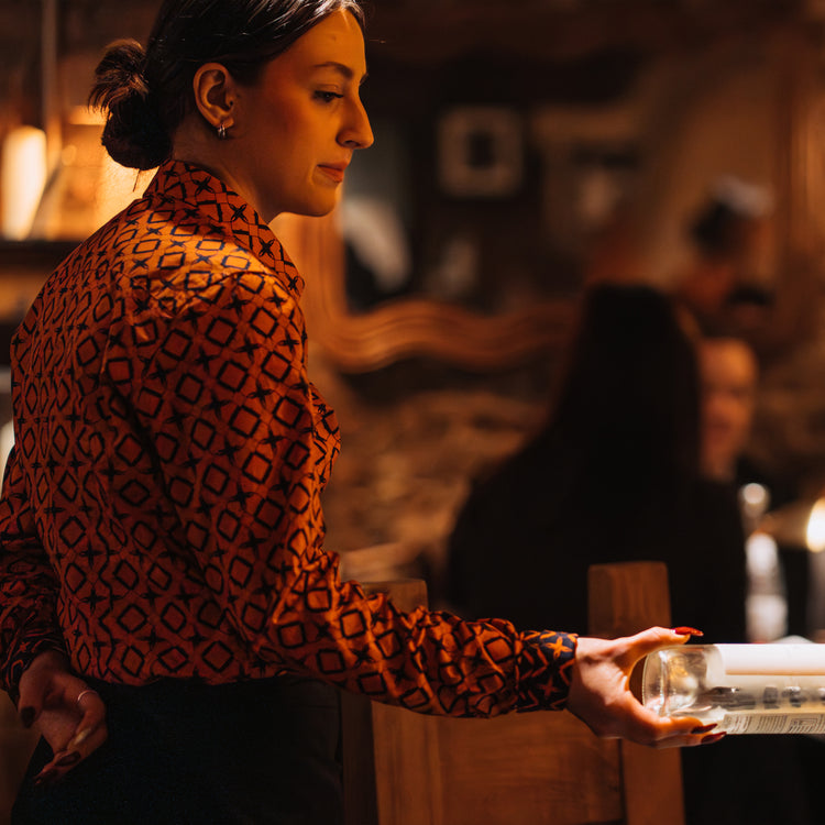 Built around fire, spice, and Silk Road storytelling, DOOD needed uniforms with personality rather than polish for polish’s sake. We developed two custom print directions: a map-inspired shirt with hand-drawn routes and sandy tones, threaded through with subtle flashes of DOOD’s signature orange, and a repeating geometric motif that works especially well behind the bar. The result feels relaxed and wearable, yet still distinctive under warm, low lighting, with uniforms that fit the atmosphere and the way the team actually works.